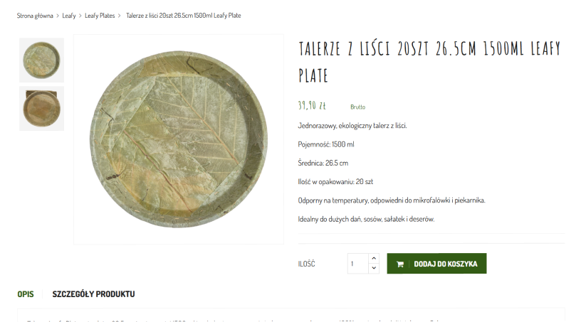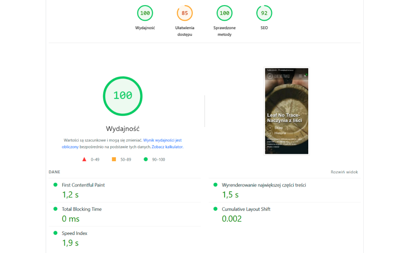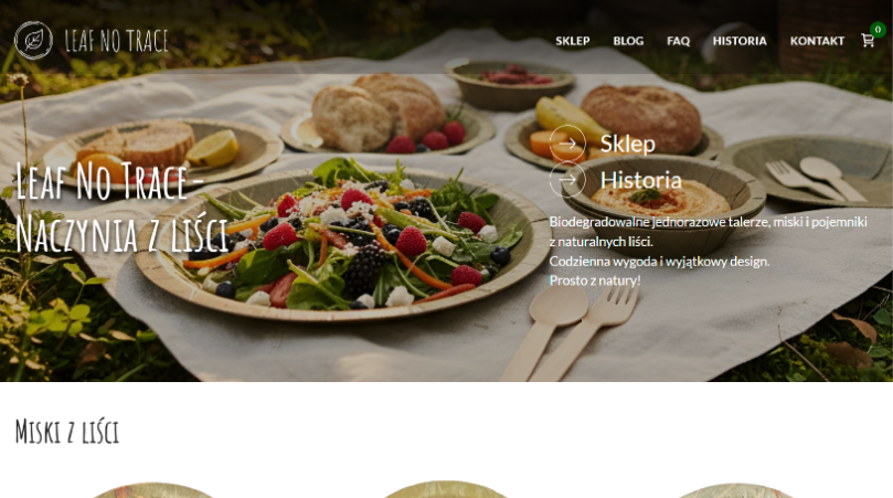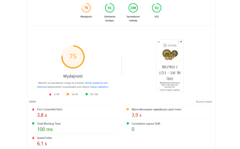 Leaf No Trace to polski sklep z jednorazowymi naczyniami z naturalnych liści. Produkt wyjątkowy i coraz bardziej popularny, ale stary szablon nie nadążał za rozwojem marki. Ładował się wolno, wyglądał generycznie i nie mówił językiem klienta. Wynik PageSpeed na mobile to 75 punktów, a pierwsza treść pojawia się po prawie 4 sekundach. Zadanie było jasne: zbudować coś, co będzie działać szybko, wyglądać profesjonalnie i sprzedawać.